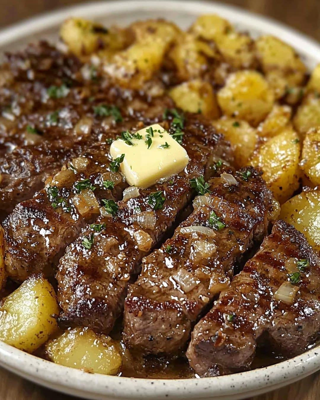 Bife Suculento na Manteiga de Alho com Batatas Douradas na Frigideira